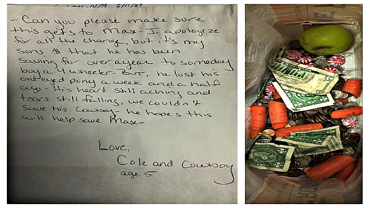 The response has been absolutely incredible. When the community saw that this family needed help getting one of it’s most beloved members’ medical help, hundreds of people contributed. But there is one donor that really touched the family’s heart. As the note says, Cole just lost his own miniature horse named Cowboy. Along with all of his savings that came in the form of jingling coins, Cole sent along with carrots, apples, and mints to keep Max happy and comfortable while he waits for his leg to be fixed.
